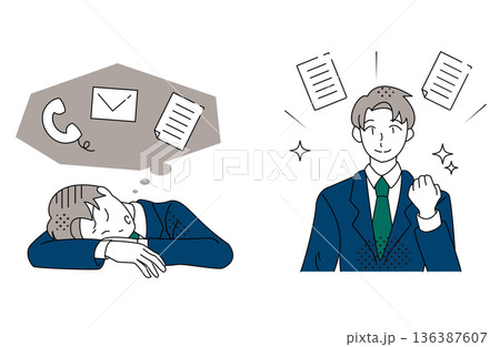 業務に追われた状態から立て直し前向きに進むビジネスマンのイラスト