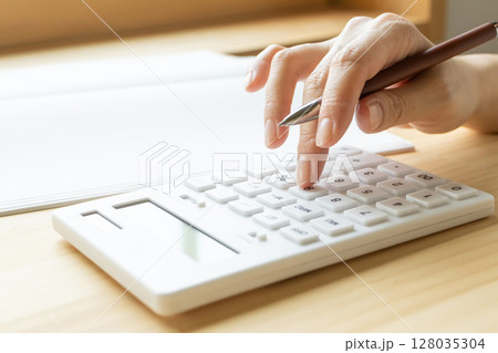 計算機とノート 計算する女性の手もと