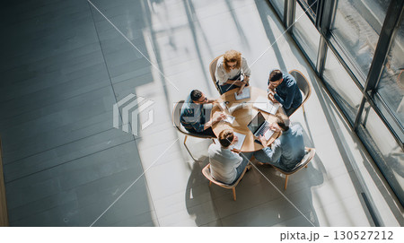 Group of professionals working together in an office top view, collaborating around a laptop during a team meeting. Great for teamwork, startup, and corporate use.