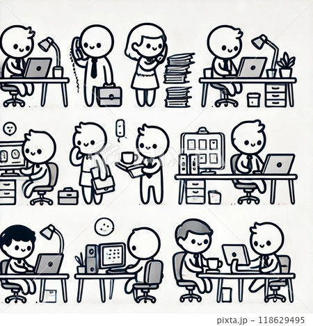 テレワークシーンの棒人間イラストセット