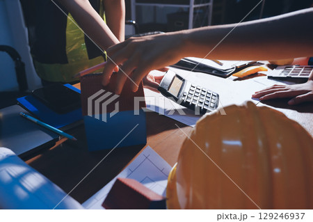 Closeup of team of industrial engineers meeting analyze machinery blueprints consult project on table in manufacturing factory. Working in manufacturing plant or production plant.