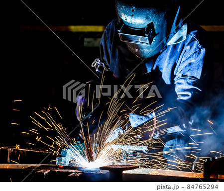 Heavy Industry Engineering Factory Interior with Industrial Worker Using Angle Grinder and Cutting a Metal Tube. Contractor in Safety Uniform and Hard Hat Manufacturing Metal Structures.
