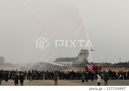 引退セレモニーの放水をくぐるEC-1電子戦機