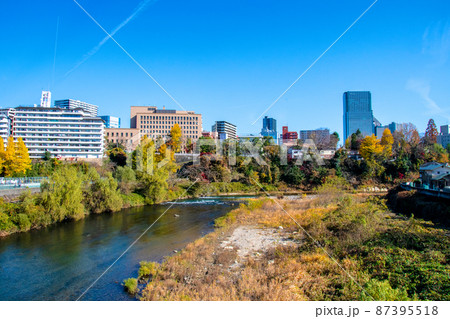 杜の都仙台 晩秋 広瀬川 評定河原橋から見渡す片平丁のビル群