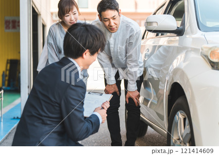 自動車購入・査定・買取にきた夫婦と接客するセールスマンの若いアジア人男性