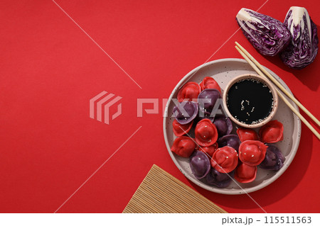 Colored dumplings on plate, soy sauce, chopsticks and pieces of cabbage on red background, space for text