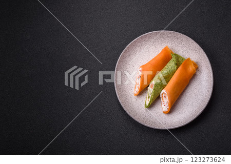 French rolled omelette stuffed with cream cheese with avocado, aragula and mushrooms for breakfast on white plate close up printed tile