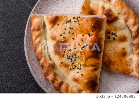 Fresh baked goods: samsa with meat, sprinkled sesame seeds, triangular samosa