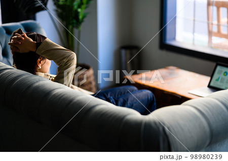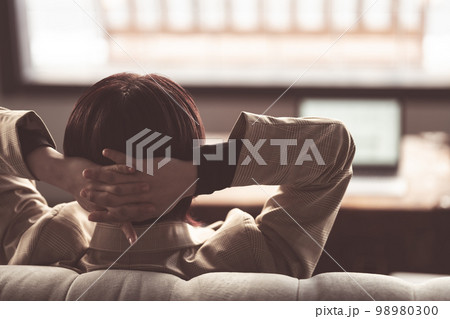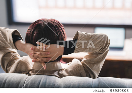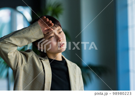 オフィス内で目を閉じて考え込む50代のビジネスマン