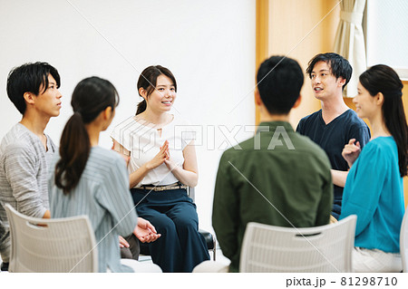 グループワーク セミナー 手を叩いて会話する若い男女