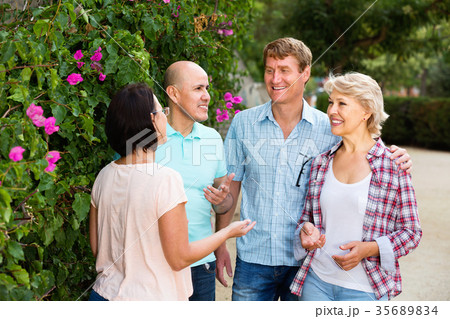 Portrait of mature cheerful males and females talking outdoors