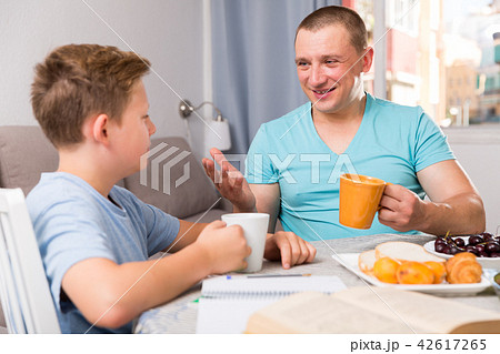 Guy with his father are resting and talking about teenage life in time eating