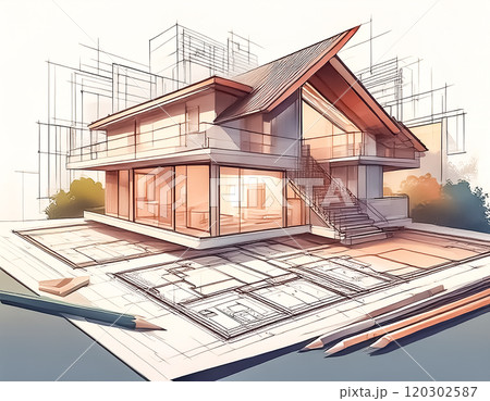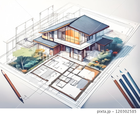 住宅の設計図の上に浮かび上がる完成模型のイメージ素材