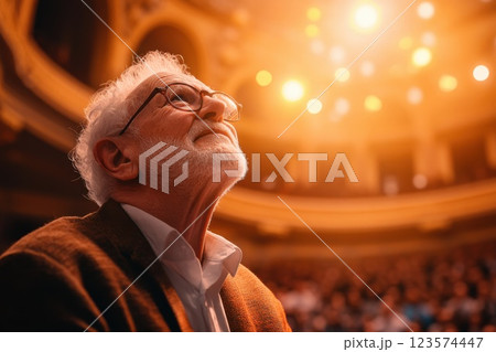 Elderly man emotional during retirement celebration receiving heartfelt standing ovation
