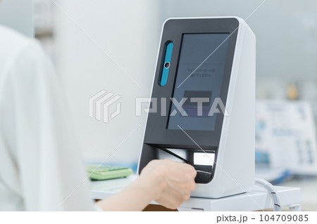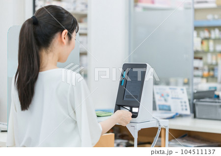 薬局・病院・ドラッグストアでマイナンバーカードをカードリーダーで読み込む女性