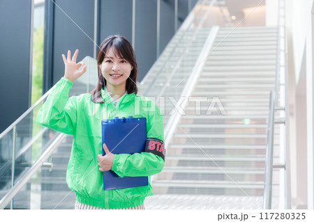 街頭で案内をする女性のイベントスタッフ
