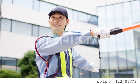 道路工事や建設現場で働く若い警備員 誘導棒で合図する男性のベクターイラスト素材
