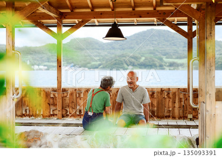 海辺の足湯で語らう老夫婦 【撮影協力:隠岐シーサイドリゾートみやび様】