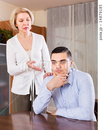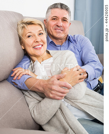 satisfied mature married couple in house are warmly reconciled after quarrel