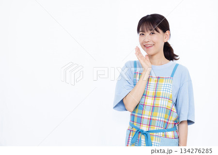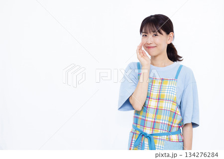 美容と健康、スキンケアお手入れシーン、目線、40代中年女性、自然光白バック