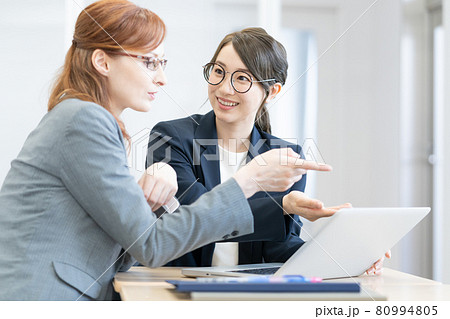 パソコンを見ながら会話する日本人と西洋人の若いメガネの女性2人 撮影協力:中央工学校付属日本語学校