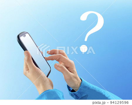 スマホをタップする手とクエスチョンマーク_青空背景