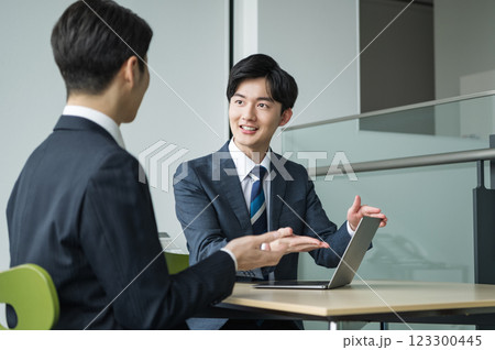 笑顔で話すスーツを着た若い男性 面接・面談・商談イメージ