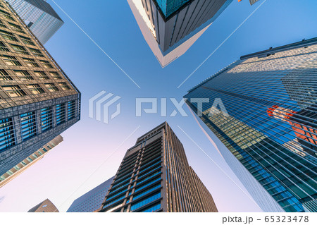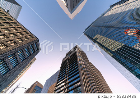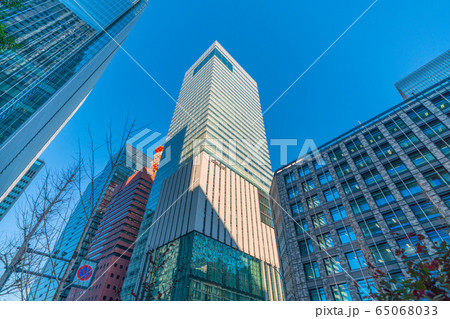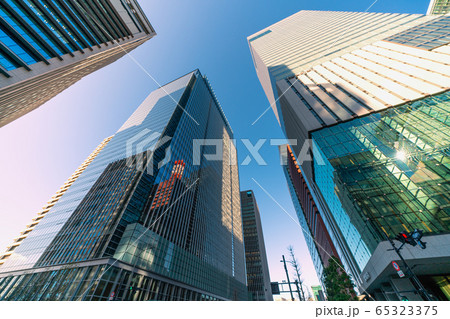 日本の東京都市景観 大手町の交差点から、青空に映える大手町や丸の内のビジネス街を望む