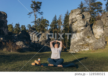 Young woman doing yoga outdoors,meditating in nature. Healthy lifestyle, strength, calm, mindfulness