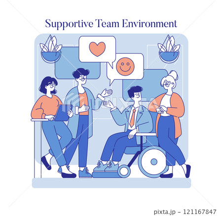 Supportive Team Environment concept. Colleagues collaborating in a positive office atmosphere. Inclusion, motivation, and workplace well-being. Vector illustration.