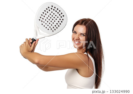 Young woman smiles while holding a paddle ready to play racquet sport