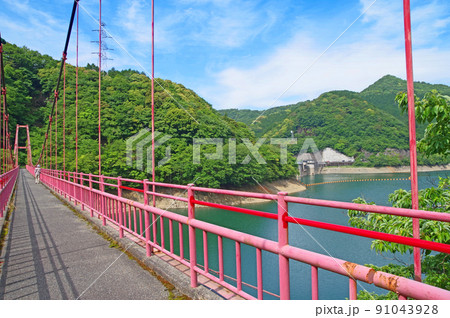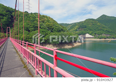福岡県小倉南区ます渕ダム湖に架かる赤い吊り橋