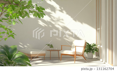 Room, interior and furniture with an empty space in a modern home or office during summer. Business, home and sofa in a luxury apartment for design, architecture or simplicity with a large window