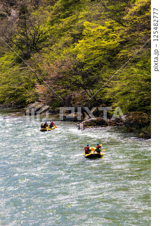 水上温泉の諏訪峡でラフティングを楽しむ人々