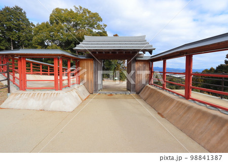 諏訪原城の復元された薬医門と空堀の三日月堀