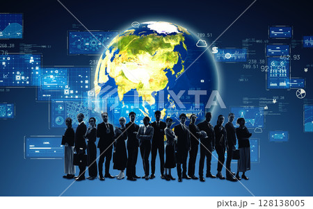 オフィスで会議する多国籍ビジネスパーソンのグループとグローバルネットワーク