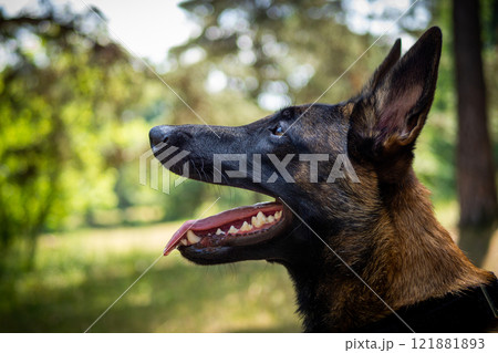 Portrait of a Belgian shepherd dog, on a walk in a green park.