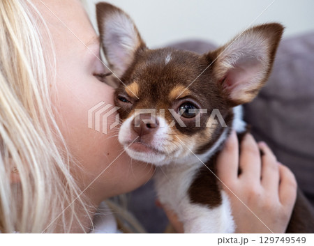 Young girl pressing soft lips against tiny chihuahua puppy, expressing pure love and warmth during gentle indoor bonding moment