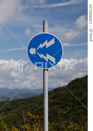 青空と緑と青の縞模様の標識