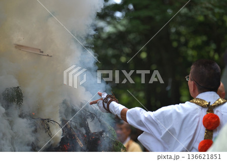 採燈大護摩 護摩木を投げ入れる修験者