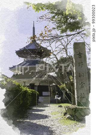 水彩画風 吉野 金峯山寺 吉野朝宮跡 奈良県吉野郡吉野町