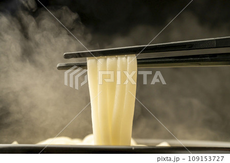 湯気の立った温かいうどんを箸で持ち上げる