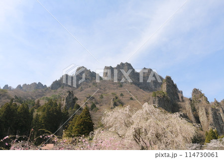 奇岩奇峰が連なる妙義山とさくら