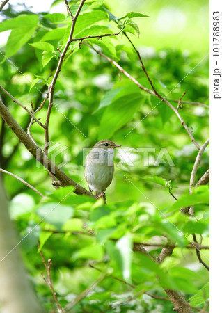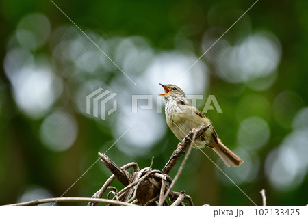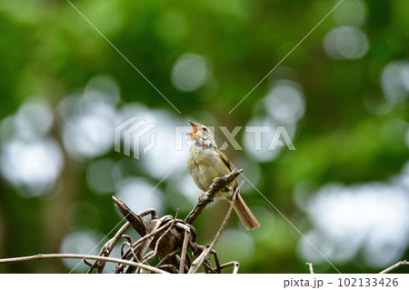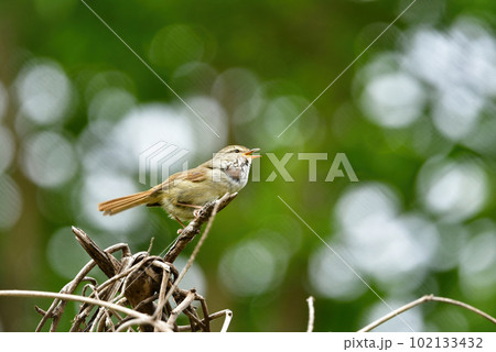 緑の公園の森で高らかに美しい声で囀る身近な野鳥ウグイス