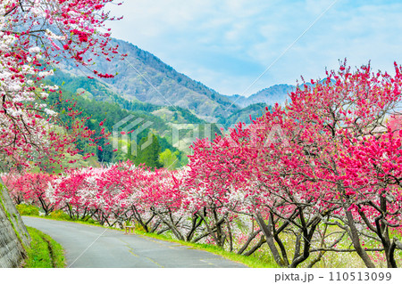 早春の陽光を浴びて淡い花を咲かせる奈良県五條市の賀名生梅林を撮影