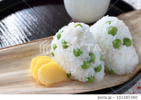 竹の皮にのせたグリンピースご飯のおにぎり