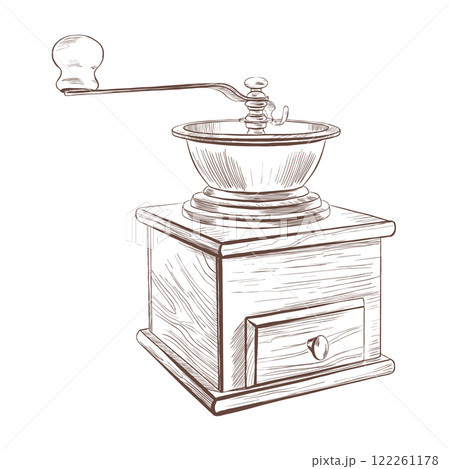 Vintage handmade wood coffee grinder for crushing coffee beans of different grind sizes. Vector hand drawn illustration for coffee menu, bar card,cafe design