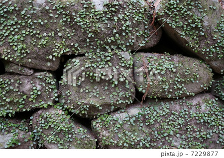 石垣に這う丸い葉のシダ植物 マメヅタ 豆蔦 差し込む光に当たる石垣のマメヅタ