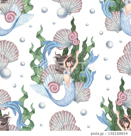 A seamless watercolor pattern featuring beautiful shells and pearls