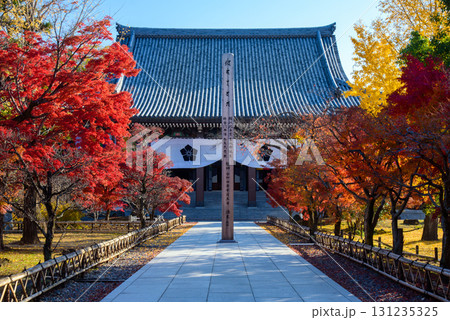 秋の京都高雄 神護寺 紅葉に包まれた金堂と石段